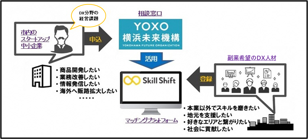 Yokohama City is implementing the "Yokohama City Innovation Personnel Exchange Promotion Project" to support startups and small and medium-sized enterprises in the city to develop new businesses and solve problems by utilizing human resources with side jobs and part-time jobs. The organization is entrusted with this work.