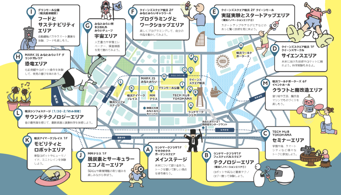 (3)内容:「横浜でみらい体験」をテーマに、横浜未来機構の会員をはじめとする企業・スタートアップ・アカデミア・個人といった多彩なイノベーター・クリエイターが一堂に会し、最先端技術や実証実験中のアイデア・ソリューションを出展・発表し、研究開発を促進する、横浜未来機構主催のイベント。